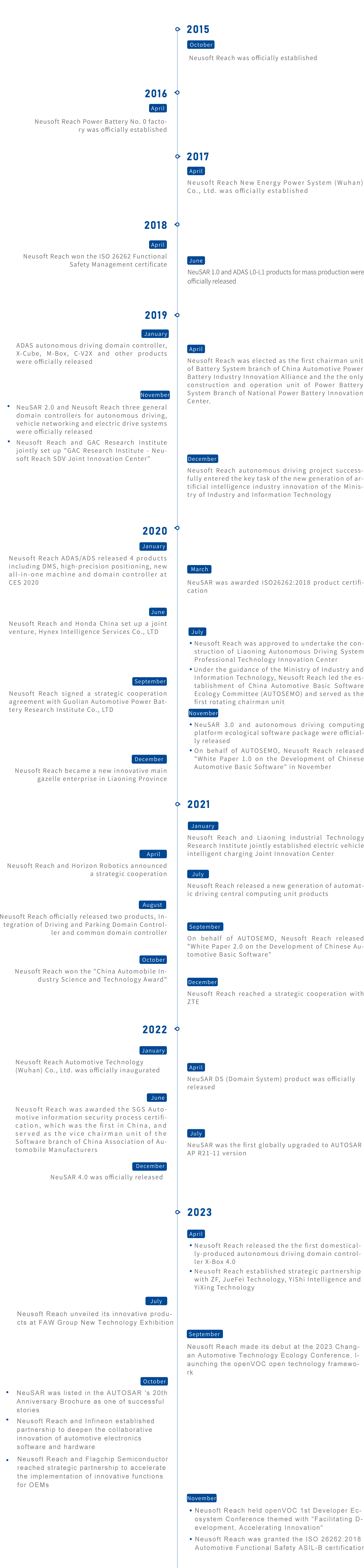 Neusoft Reach Automotive Technology (Shanghai) Co., Ltd., founded in October 2015,which is an industry-leading supplier of basic software, SOA middleware, autonomous driving, and cross domain integrated vehicle cloud technology products and services. With software technology as its core, Neusoft Reach integrates key technologies such as big data, artificial intelligence, and basic software, focusing on key areas such as ADAS, basic software and operating systems,providing outstanding and iteratively upgraded core technologies, software and hardware integration products, and software platform products for automotive enterprises in the future technological innovation and development, and is committed to becoming trusted partner in the era of SDV for OEMs.