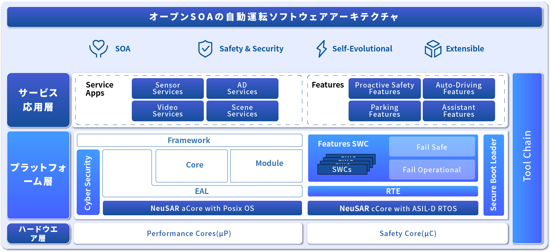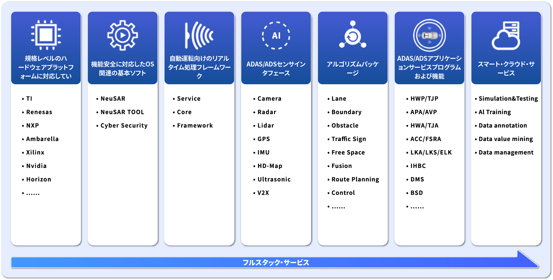 東軟睿馳(Neusoft Reach)の運(yùn)転支援事業(yè)は、フルスタック自社開(kāi)発技術(shù)を基盤とし、オープンなソフトウェアアーキテクチャを活用することで、エコシステムパートナーとの継続的で深いプロジェクト協(xié)力を?qū)g現(xiàn)しています。これにより、ユーザーおよびパートナーが持つ多様なレベルのニーズに応じて、幅広い製品ラインアップを提供可能です。