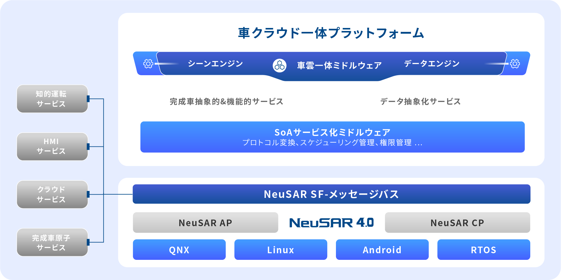 東軟睿馳車クラウド一體核心演算プラットフォームは車クラウド能力整合を行い、ドメイン間シナジー、車クラウドシナジー能力モデルとオープン技術(shù)フレームを構(gòu)築、車クラウド間のサービス化通信リンクの貫通によって、車側(cè)とクラウド側(cè)の知能シナジー演算を?qū)g現(xiàn)させ、OEMが車側(cè)ECU能力とクラウド側(cè)サービスコネクテッドに基づく知能化シーン機(jī)能の構(gòu)築にエンパワーメントし、開発難易度とコストを大幅に低減して、OEMがデジカル化、知能化アップグレードとモデルチェージへの加速に助力する。